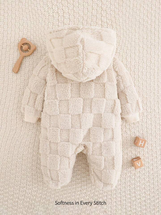 Baby Boy/ Girl Cartoon Rabbit Ear Hooded Thick Fleece Jumpsuit, Suitable For Autumn/Winter.