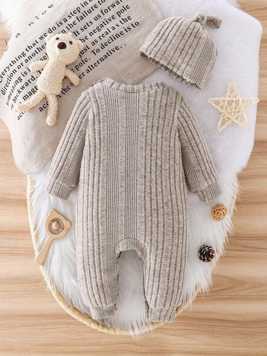 Ribbed Knit Casual Long Sleeve Romper With Adorable Hat (2 Pc)