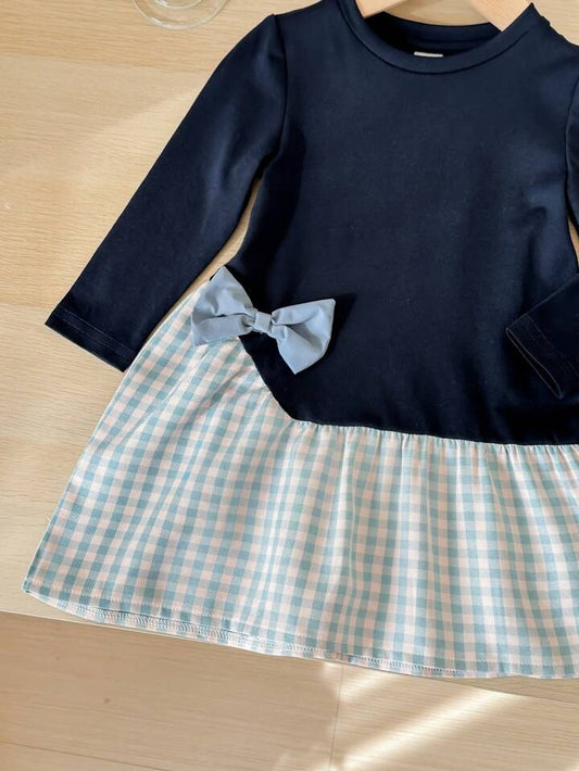 Casual Knitted Crew Neck Long Sleeve Plaid Patchwork Dress.