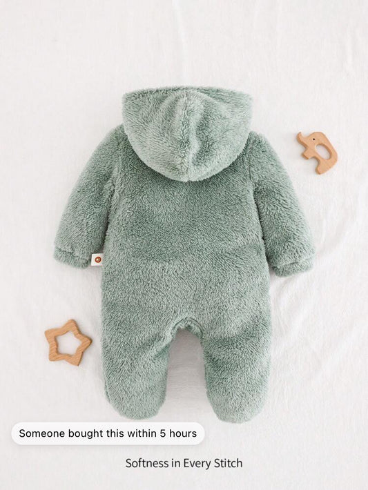 Baby Boy/ Girl Cartoon Rabbit Ear Hooded Thick Fleece Jumpsuit, Suitable For Autumn/Winter.
